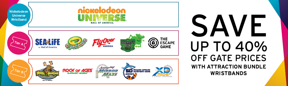 Nickelodeon Universe: $10 Off All-Day Wristbands Planning a trip to the Mall of America? Here's a great deal on Nickelodeon Universe Unlimited Ride Wristbands - save $10 when you show this coupon through Thursday, May 24th! Please note that this coupon is valid Monday - Thursday only. This drops the price of a wristband from $35.99 down to $25.99.